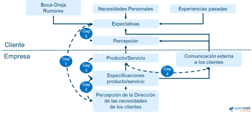 • Gap 5: No hay un consenso claro sobre lo que significa este Gap. Inicialmente significaba la diferencia entre Expectativas y Percepción de servicio, que puede aparecer cuando el cliente confunde una característica de calidad del servicio como algo no deseado. Pero en la actualidad también se utiliza el Gap para identificar la insatisfacción global del cliente, que aparece como el resultado de la suma de los otros Gaps. Particularmente, en Openmet preferimos la primera de las dos versiones, porque enriquece el análisis de las causas de la insatisfacción.