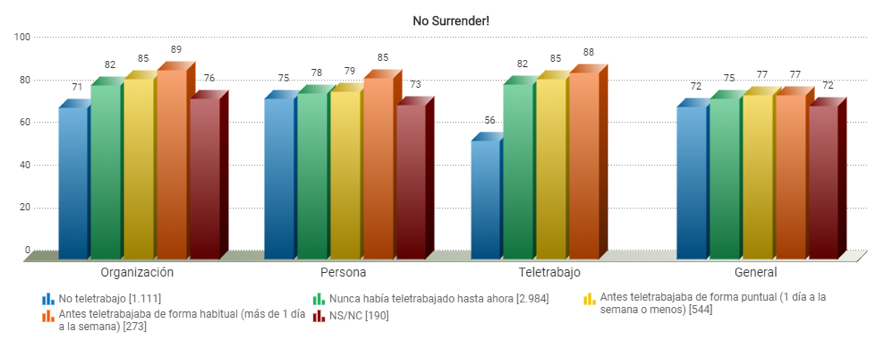 La primera conclusión del estudio que observamos es el alto grado de resiliencia ante la crisis que existe entre los trabajadores. A pesar de la complejidad de la situación actual, el feedback recibido nos indica que las organizaciones y los trabajadores se enfrentan positivamente a la crisis actual, con resultados de más de 75 puntos de valoración ponderada en la escala de 0 a 100 en las 4 dimensiones evaluadas en la encuesta COVID-19 No Surrender: respuesta Organizativa, respuesta Personal, evaluación del Teletrabajo y evaluación General.