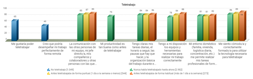 - Las personas que teletrabajan (por primera vez o ya desde antes de la crisis) responden en general muy positivamente a todas las preguntas, con valoraciones por encima de 78 en todos los casos. En general constatamos el correcto funcionamiento del teletrabajo y su aceptación por parte de los trabajadores.